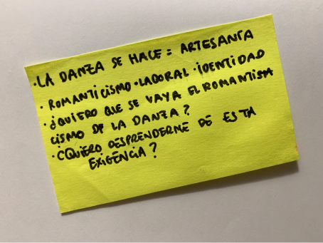 Durante el tiempo en el que llevamos trabajando en este proyecto nos hemos encontrado con bailarinxs de varios lugares, a través de entrevistas y laboratorios/encuentros. Las primeras sesiones tuvieron lugar en la Casa Encendida, Madrid, gracias al programa Artistas en Residencia. Participaron treinta bailarinas, la mayor parte afincadas en la ciudad. También se realizaron encuentros en Carballo, Galicia, gracias a las Residencias Paraíso que organiza el Colectivo Rpm y en Barcelona, gracias a La Poderosa y su ciclo Hacer Historias. El objeto de los encuentros/laboratorios es construir un espacio seguro de reflexión y práctica dónde pensar sobre la construcción de nuestra identidad a través de nuestro trabajo como bailarinas.