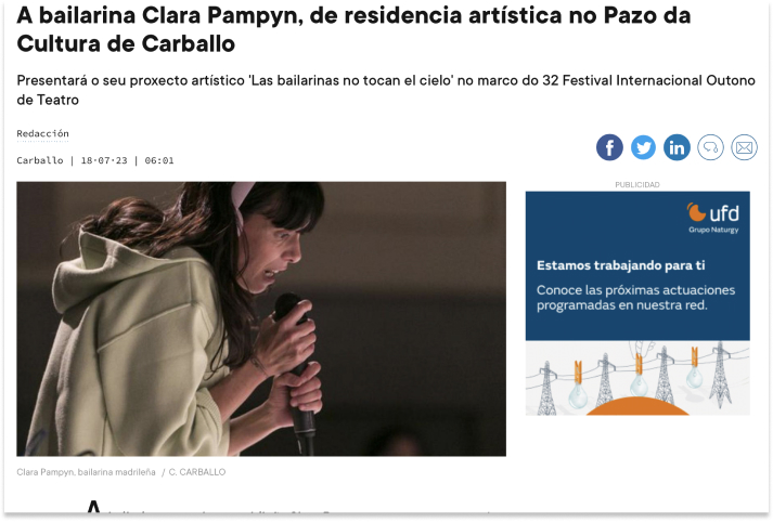 Por otra parte, desarrollamos una pieza escénica, llamada Las que bailan, que pretende ser canal de otros cuerpos, voces, vivencias, bailes, recogiendo los testimonios y movimientos compartidos a lo largo de este proceso. Esta pieza, en formato corto, estuvo en Acento 2023, en La Casa Encendida, en FIOT Carballo, Galicia, en Hacer Historias de La Poderosa, Barcelona, y estrenará su versión larga en Replika Teatro, Madrid, a finales de 2024.