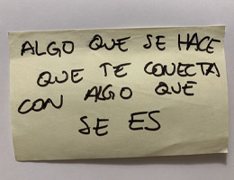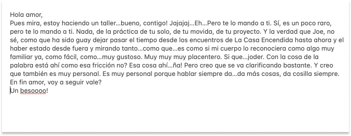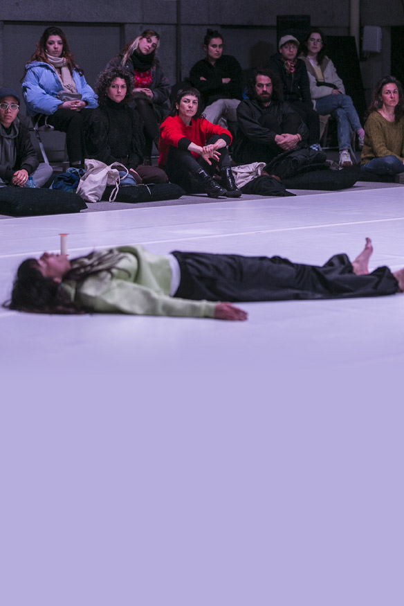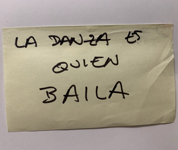 Otra práctica que se dedica a ser canal de las palabras de otras, palabras que hablan de nuestra profesión y de lo que de ahí se deriva. Esta práctica trata de generar un diálogo en diferido entre bailarinas de diversos lugares. Una cadena de mensajes de audio en la que somos canal de las palabras de otras compañeras. Se trata de escuchar, repetir, contestar, generando un red de mensajes y saberes entre bailarinas contemporáneas de diversos contextos, lugares, momentos vitales, etc. A esta práctica la llamamos: Traducción (Testimonios)